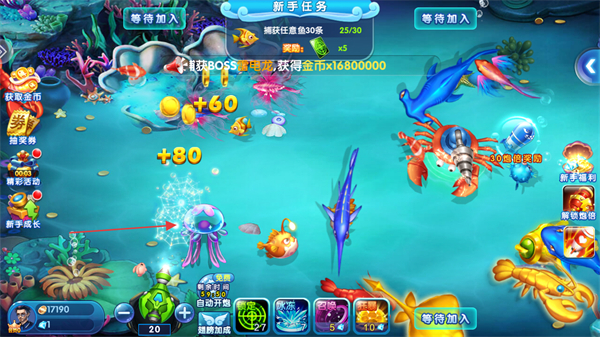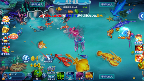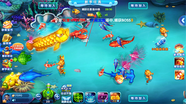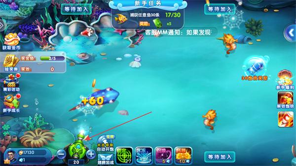 2、持續(xù)發(fā)射漁網(wǎng)捕捉游動(dòng)的各類(lèi)魚(yú),推進(jìn)新手任務(wù)進(jìn)度,留意捕獲魚(yú)后獲得的金幣。