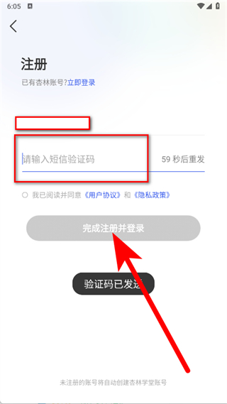 4、輸入收到的短信驗(yàn)證碼,勾選同意后,點(diǎn)擊完成注冊(cè)并登錄。