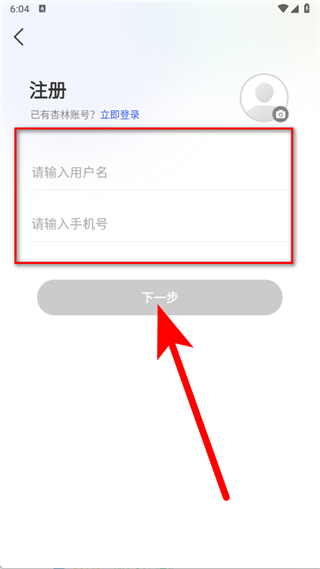 3、在注冊(cè)頁(yè)面,依次輸入用戶名、手機(jī)號(hào),點(diǎn)擊下一步。