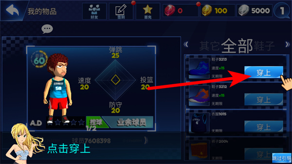 4、在我的物品界面,點(diǎn)擊鞋子對(duì)應(yīng)的穿上按鈕,可給球員穿上該鞋子,提升球員的彈跳等屬性,增強(qiáng)戰(zhàn)力。