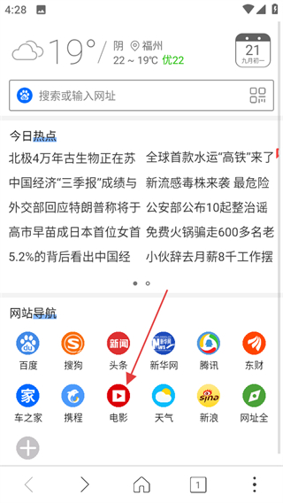 1、進入高速瀏覽器首頁頁面,點擊電影,進入電影相關板塊。