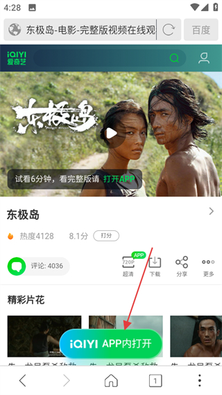 4、在播放源網址,根據(jù)頁面的看完整版打開愛奇藝提示,點擊打開即可觀看電影。