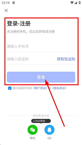 4、在登錄-注冊頁面,輸入手機號、驗證碼,點擊登錄,完成賬號登錄。