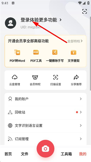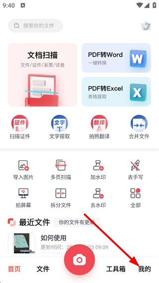1、在口袋掃描儀主頁(yè)面,點(diǎn)擊底部的我的,進(jìn)入個(gè)人中心頁(yè)面。