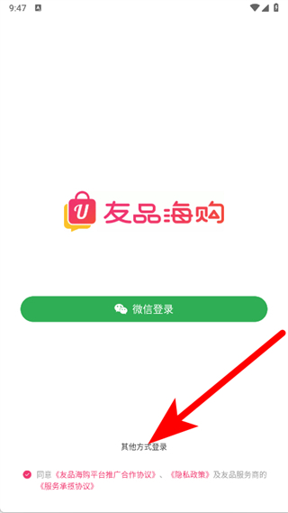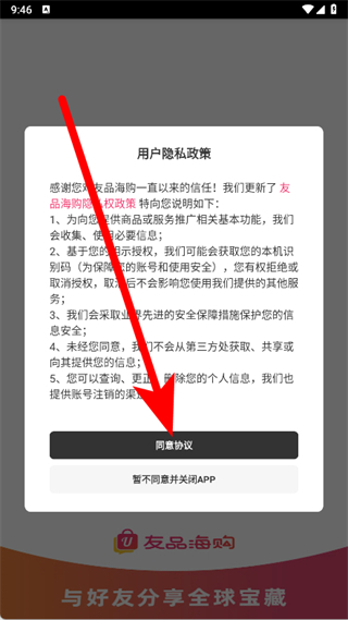 1、打開友品海購,在彈出的用戶隱私政策窗口中,仔細(xì)閱讀后,點(diǎn)擊同意協(xié)議。