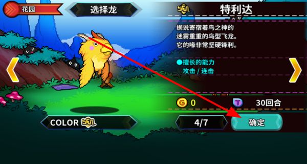 1、開局花園場景選擇龍,如特利達這種鳥型飛龍,查看其擅長能力后點擊確定,即可選定該龍進行養(yǎng)成。