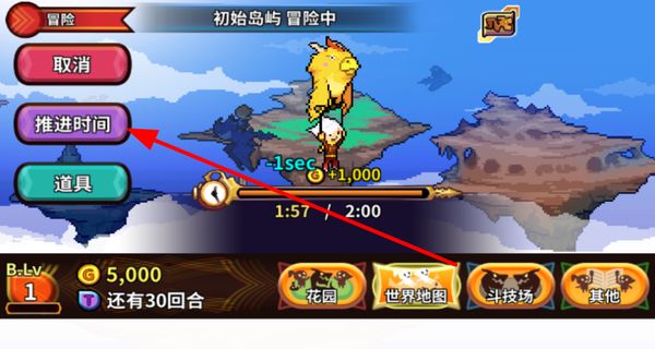3、在游玩體驗冒險界面點擊推進時間按鈕,可加快冒險進程,獲取金幣等資源,助力龍的成長。