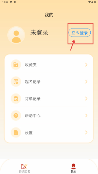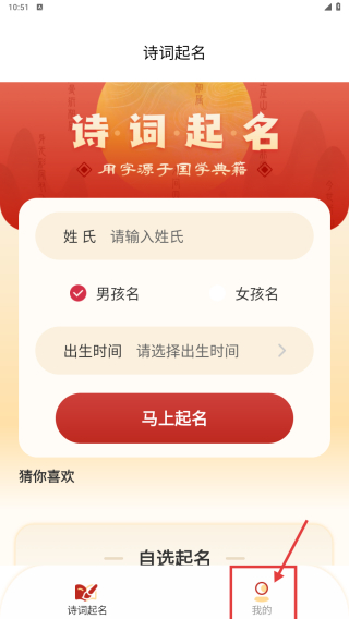 1、打開詩詞起名應用,點擊底部我的選項,進入個人中心頁面。