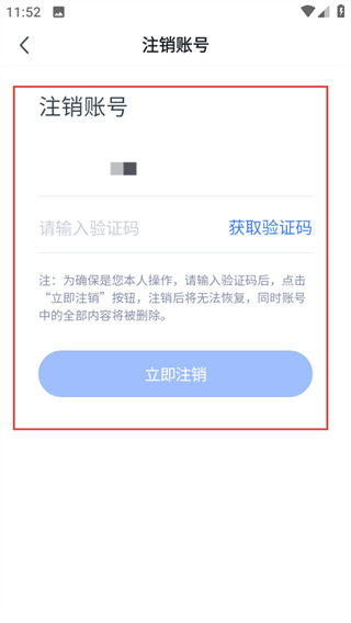 5、在驗(yàn)證頁(yè)面,輸入信息后點(diǎn)擊立即注銷(xiāo)可完成賬號(hào)注銷(xiāo)。
