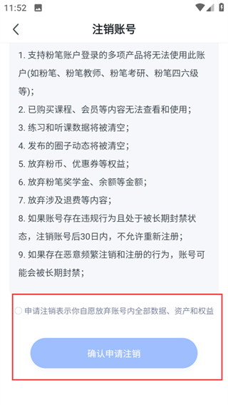 4、在注銷(xiāo)賬號(hào)說(shuō)明頁(yè)面,勾選同意后點(diǎn)擊確認(rèn)申請(qǐng)注銷(xiāo)可進(jìn)入驗(yàn)證頁(yè)面。