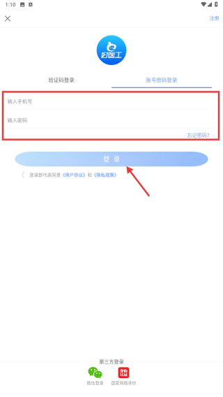 4、在賬號密碼登錄頁面,輸入手機(jī)號碼和密碼后點(diǎn)擊登錄按鈕,完成賬號登錄操作。