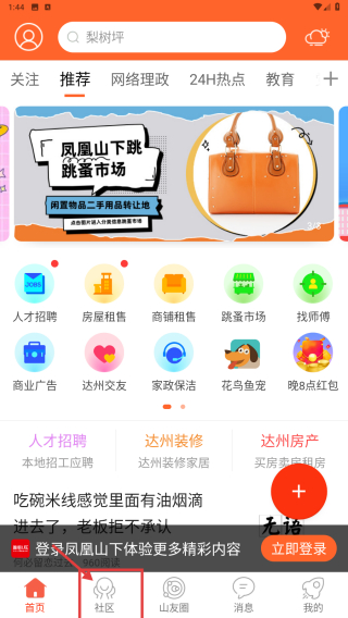 1、打開(kāi)本地資訊應(yīng)用,點(diǎn)擊底部社區(qū)選項(xiàng),進(jìn)入社區(qū)頁(yè)面。