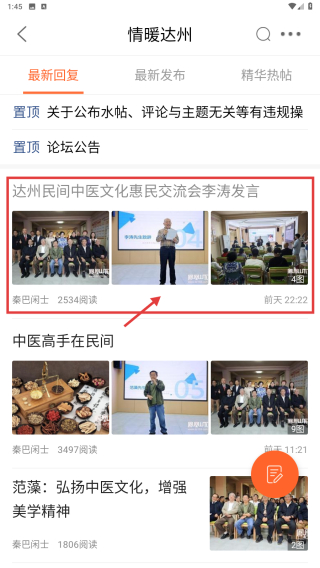 2、在社區(qū)頁(yè)面,點(diǎn)擊情暖達(dá)州板塊,瀏覽該板塊下的資訊列表。