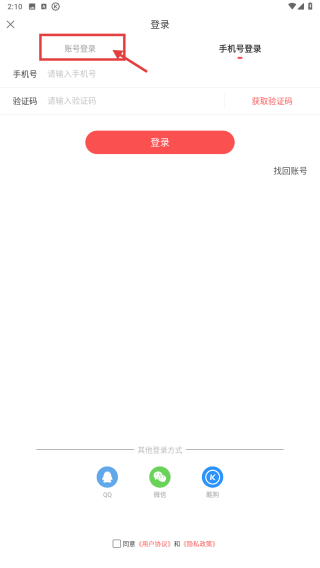 3、在登錄方式選擇界面,點擊賬號登錄選項,進入賬號登錄頁面。