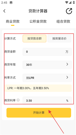 2、選擇計(jì)算方式,輸入商貸金額,選擇商貸年限和利率方式后點(diǎn)擊開始計(jì)算。