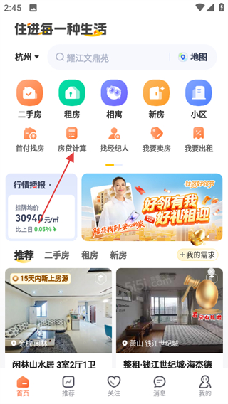 1、打開我愛我家,點(diǎn)擊頁面中的房貸計(jì)算,可進(jìn)入貸款計(jì)算器頁面。