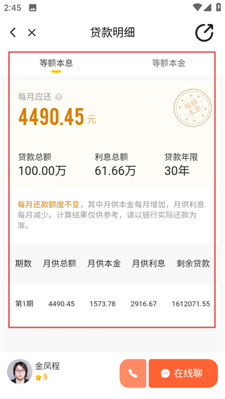 3、計(jì)算完成后,可查看貸款明細(xì),包括每月應(yīng)還金額、貸款總額利息總額等信息。