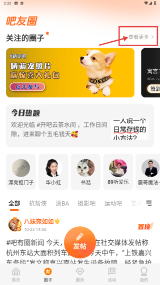 2、在吧友圈頁面,點(diǎn)擊查看更多選項(xiàng),進(jìn)入圈子廣場(chǎng)頁面。
