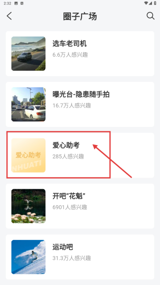 3、在圈子廣場(chǎng)里,找到愛心助考圈子條目,點(diǎn)擊進(jìn)入圈子詳情頁。