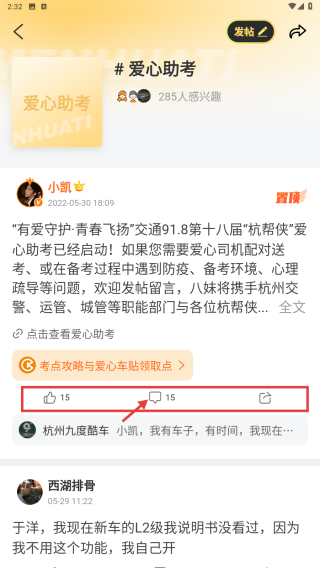 4、在圈子詳情頁,可參與帖子的評(píng)論互動(dòng),如對(duì)愛心助考相關(guān)內(nèi)容進(jìn)行討論。