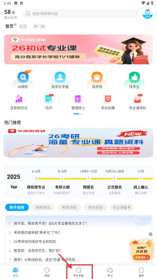 1、打開考研社交應(yīng)用,點(diǎn)擊底部學(xué)長學(xué)姐選項(xiàng),進(jìn)入學(xué)長學(xué)姐頁面。