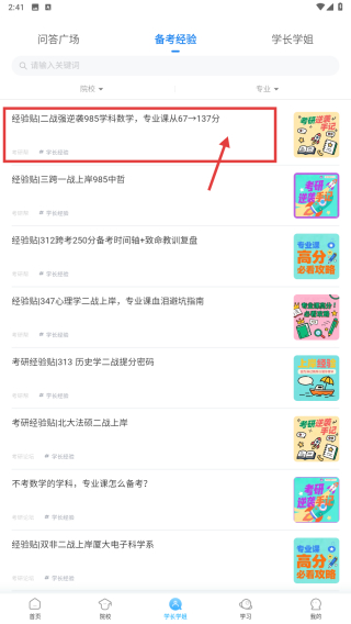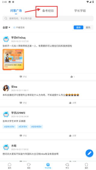 2、在學(xué)長學(xué)姐頁面,點(diǎn)擊備考經(jīng)驗(yàn)標(biāo)簽,瀏覽備考經(jīng)驗(yàn)貼列表。