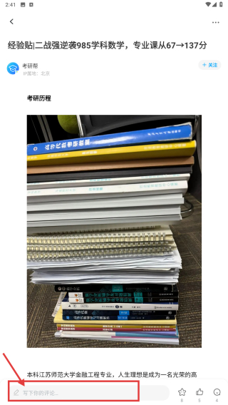 4、在經(jīng)驗(yàn)貼詳情頁,可在底部輸入框參與評論互動,分享自己的考研見解或提問。