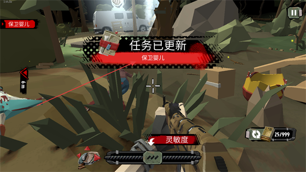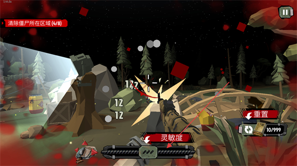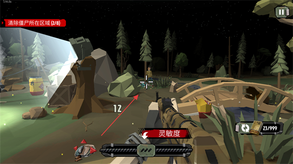 1、在森林場(chǎng)景中,瞄準(zhǔn)僵尸所在區(qū)域,使用武器射擊,逐步清除僵尸,完成清除僵尸所在區(qū)域的任務(wù)進(jìn)度如2/8、4/8。
