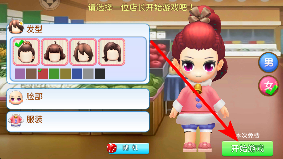 1、開局選擇店長,可自定義發(fā)型、臉部、服裝,也可隨機(jī)生成,選擇后點擊開始游戲,即可進(jìn)入超市經(jīng)營界面,開啟經(jīng)營之旅。