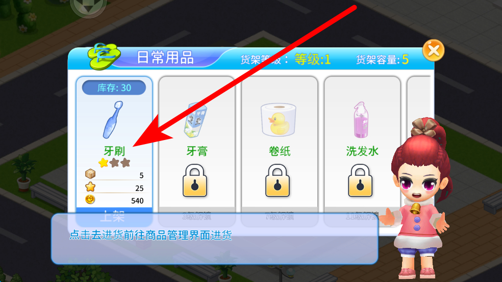 2、進(jìn)行商品管理,進(jìn)入貨架界面選擇牙刷等商品進(jìn)貨上架,根據(jù)庫存和貨架容量合理安排,滿足顧客需求,提升營業(yè)額。