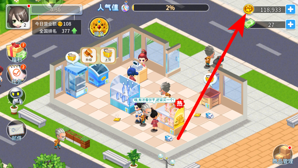 3、關(guān)注金幣積累,通過顧客消費(fèi)和完成任務(wù)獲取金幣,金幣可用于進(jìn)貨、升級超市設(shè)施,助力超市規(guī)模擴(kuò)大。