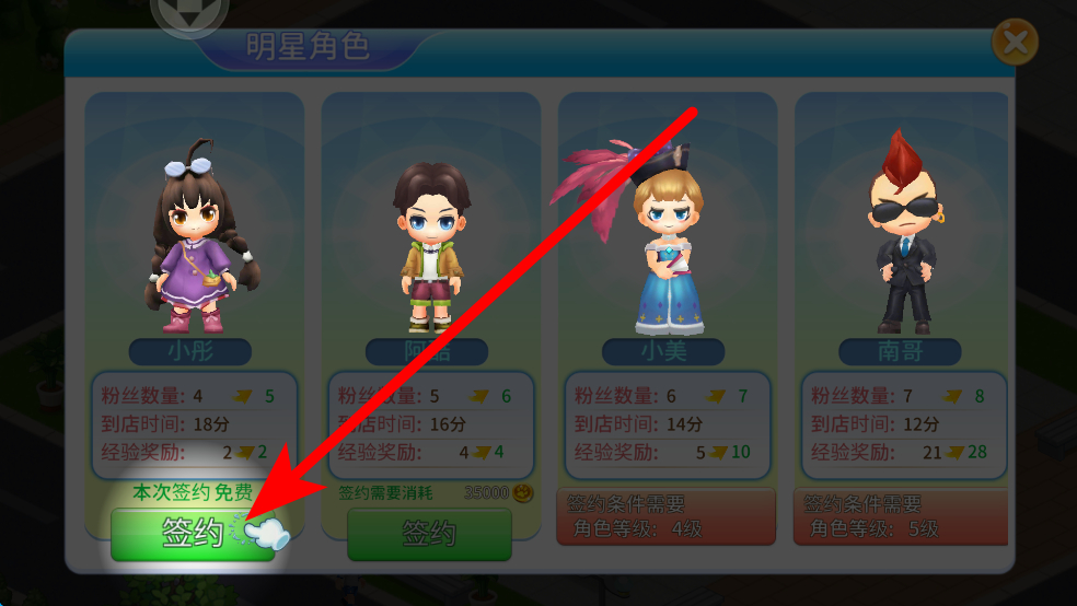 4、合理簽約明星,選擇可免費簽約的明星,簽約后明星到店可吸引更多顧客,增加超市人氣,提升經(jīng)營效益。