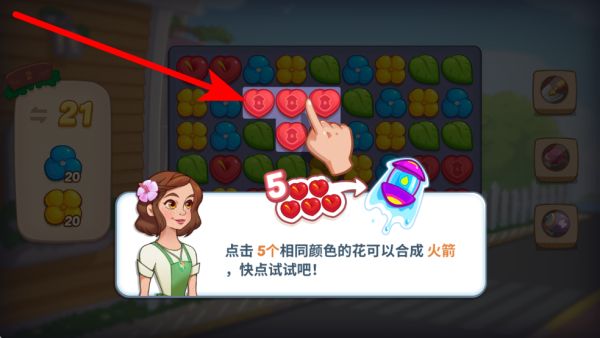 3、消除闖關(guān)時,需匹配相同顏色花朵,五個相同顏色可合成火箭道具,助力快速清除目標(biāo)。