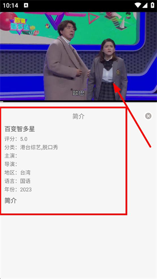 4、在簡介查看頁面,即可查看該綜藝的評(píng)分、分類、主演等信息。