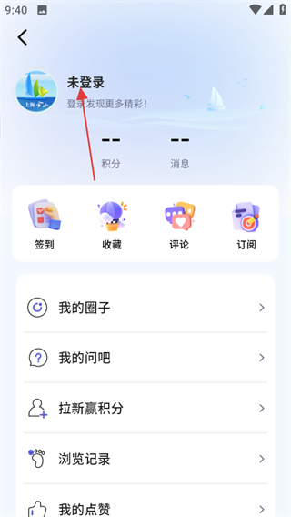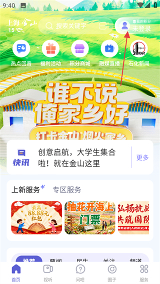 1、打開上海金山,點擊頁面右上角未登錄,可進(jìn)入個人中心頁面。