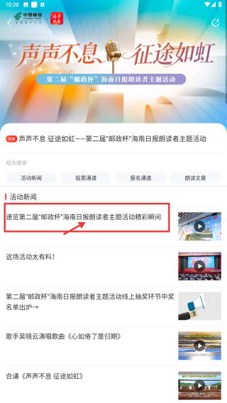 4、在專題詳情頁,查看速覽第二屆郵政協(xié)海南日報(bào)朗讀者主題活動(dòng)精彩瞬間等活動(dòng)新聞,了解活動(dòng)詳情。
