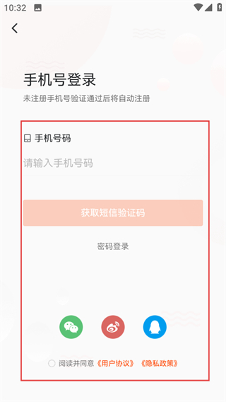 3、在手機(jī)號(hào)登錄頁(yè)面,輸入信息,同意協(xié)議后可完成登錄。