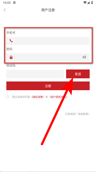 3、進入注冊頁面,在指定輸入框中,依次填寫手機號碼,并設置符合要求的登錄密碼。