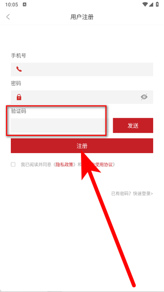 5、在驗證碼輸入框中填寫收到的驗證碼,勾選后,點擊注冊按鈕,完成賬號注冊。