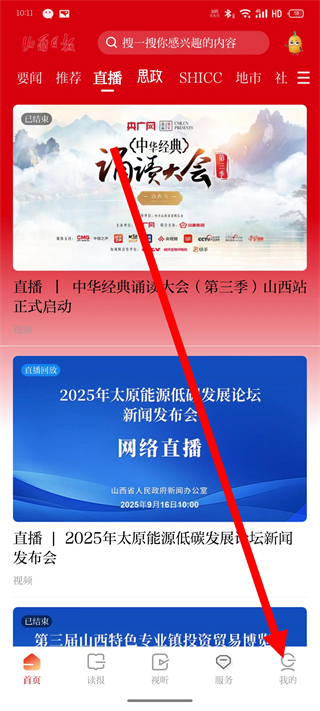 1、打開(kāi)山西日?qǐng)?bào),進(jìn)入首頁(yè),看到推薦內(nèi)容及搜索框。