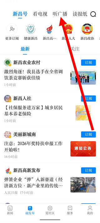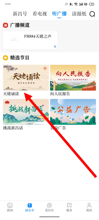 2、在融發(fā)布頁面中,找到并點擊聽廣播選項,進入廣播功能界面。