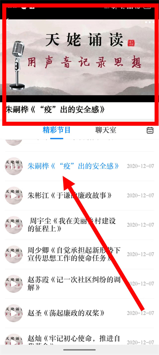 3、在廣播功能界面里,找到天姥誦讀板塊并點擊進入,看到相關(guān)廣播節(jié)目列表。