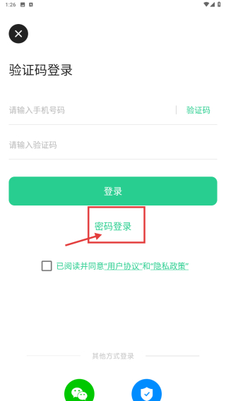 3、在登錄方式選擇界面,點擊密碼登錄選項,進入手機號密碼登錄頁面。