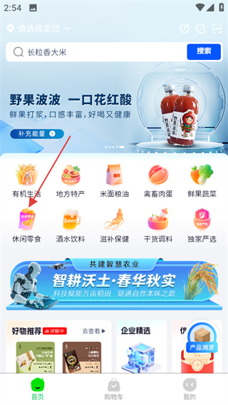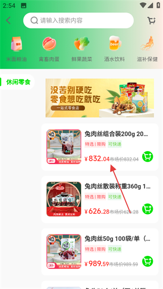 1、打開(kāi)米梁源,點(diǎn)擊休閑零食分類(lèi),可進(jìn)入休閑零食商品列表頁(yè)面。