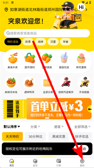 1、打開樂送外賣,點擊底部導(dǎo)航欄的我的,進(jìn)入個人中心頁面。