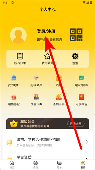 2、在個人中心頁面,點擊登錄注冊區(qū)域,進(jìn)入手機(jī)號登錄界面。