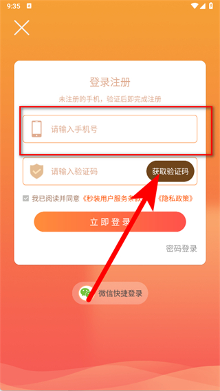 3、在登錄注冊頁面,輸入手機(jī)號,點(diǎn)擊獲取驗(yàn)證碼。