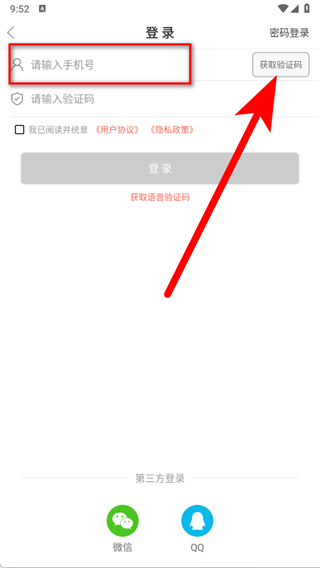 3、在登錄頁面,輸入手機(jī)號(hào),點(diǎn)擊獲取驗(yàn)證碼。