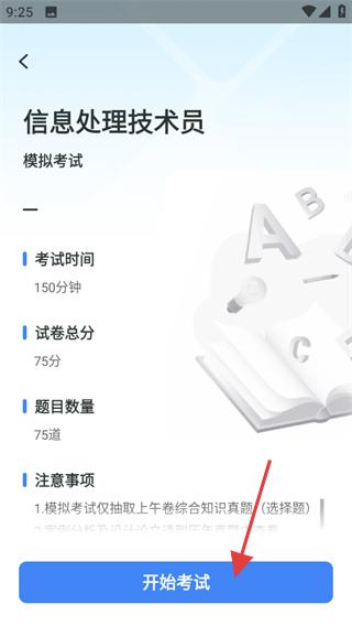 2、在模擬考試說明頁面,點擊開始考試可進入模擬考試答題頁面。