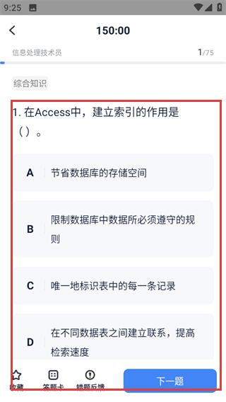 3、在答題頁面,可進行題目作答,點擊下一題可繼續(xù)作答后續(xù)題目。